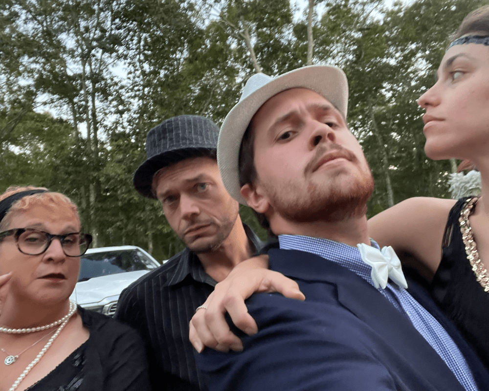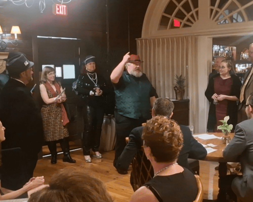 Our full cast of four or more professional actors invades your event. When one drops dead before your very eyes, everyone is deputized as detectives, teaming up to interrogate suspects and solve the crime! We can turn any venue into a murder mystery dinner theater.