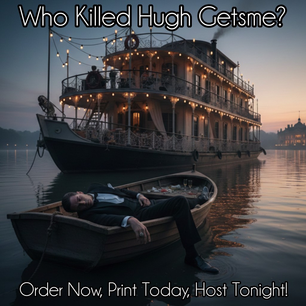 Climb aboard East Egg Cruise Lines for a night of lavish luxury. But when our exotic host is murdered, everyone is suspect and Detective in the case of WHO KILLED HUGH?